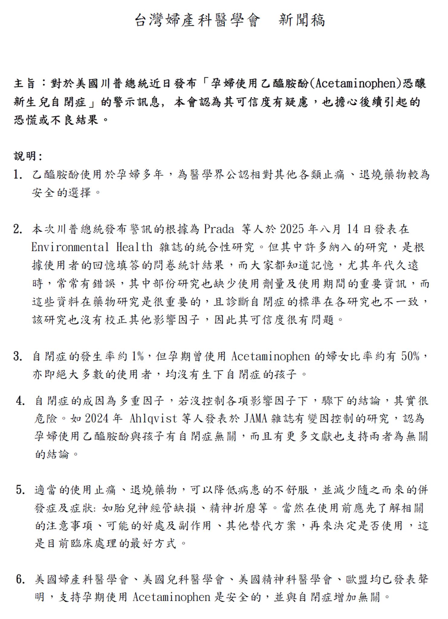 事實澄清重點如下: 乙醯胺酚使用超過數十年,是孕期退燒止痛的安全首選。 川普引用的研究,來源資料多為「問卷回憶填寫」,缺乏關鍵劑量與期間資訊,也未校正其他可能影響自閉症的因子。可信度存疑。 約有 50% 的孕婦曾使用乙醯胺酚,但僅約 1% 的孩子被診斷為自閉症,顯示兩者之間並無直接因果關係。相反地,高品質研究(如 JAMA 期刊)更進一步指出,乙醯胺酚的使用與自閉症無顯著相關。 孕期若不適(如發燒、劇烈頭痛),反而可能影響胎兒健康,適當用藥更為重要。 各大醫學會如美國婦產科醫學會、兒科醫學會、歐盟皆支持孕期使用此藥的安全性。